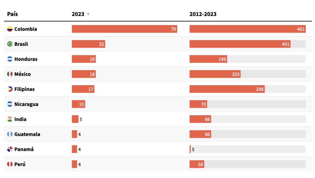 Entre los países de América Latina que lideran este terrible ranking de asesinatos de personas defensoras ambientales está: Brasil, Colombia, Hondura y México.