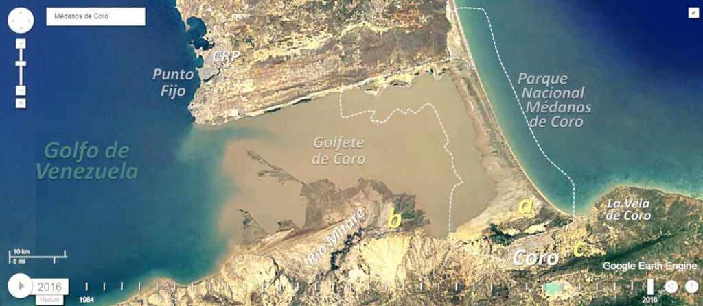 El Parque Nacional Médanos de Coro (a) abarca todo el istmo y parte de la Península de Paraguaná (línea punteada). Sus dunas son emblemáticas para el turismo y se concentran en una franja (~ 2.500 ha) en la base del istmo (Figura 2). En la secuencia que cubre el periodo 1984-2016 se reconoce su lento pero indetenible desplazamiento con sentido este-oeste. Es previsible que este fenómeno terminará por cerrar la autopista entre Coro y la península. Pero hay otros impactos dentro del área protegida que es bueno vindicar. Por ejemplo, entre las dunas destaca un oasis. Este vergel es artificial, cubre un poco más de mil hectáreas y se nutre gracias a las aguas residuales provenientes de la ciudad de Coro, que alberga a unos 260.000 habitantes. En el tratamiento de estas aguas servidas han operado la insuficiencia e intermitencia durante muchos años. Estas aguas negras tienen el valor agregado de ser utilizadas para el riego de cultivos y potreros dentro del área protegida; esto ha mejorado la fertilidad de esos suelos, pero las concentraciones de cadmio y plomo atestiguan un riesgo sanitario. Se desconoce el impacto ambiental que estos efluentes urbanos tienen sobre las especies y los hábitats; un efecto que quizá será sepultado en pocas décadas, acorde con la dirección que llevan las dunas y su velocidad de desplazamiento (~1 km cada 10 años). Otro problema difícil de ocultar ocurre con el enorme Centro de Refinación de Paraguaná y sus oleoductos submarinos, pues las fugas y derrames son periódicos, contaminando el Golfete de Coro, con efectos evidentes en litorales, aguas, malacofaunas y cosechas pesqueras.