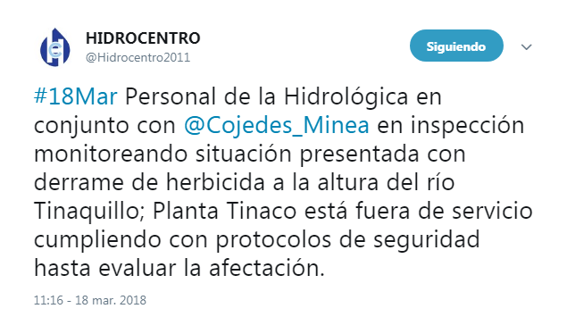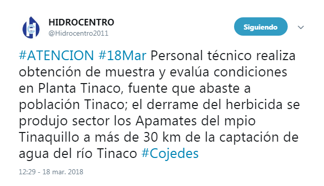 Hidrocentro y MINEA_COJEDES han informado a través de las redes sociales que el pasado viernes una gandola de Agropatria colisionó y cayó al río Tinaquillo, generando un derrame del herbicida que contenía. Dicho derrame se produjo en el sector Los Apamates (municipio Tinaquillo), a más de 30 kilómetros de la captación de agua del río Tinaco, en Cojedes.