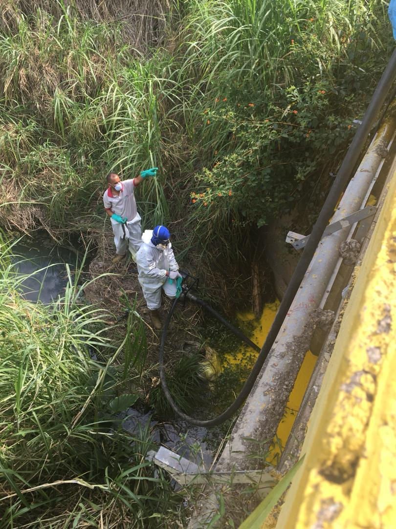 El día lunes se anunció realizado de barrido y recolección del sólido y la colocación de contenedores de metal, además de extracción del líquido concentrado en el área para ser confinados a contenedores plásticos.
