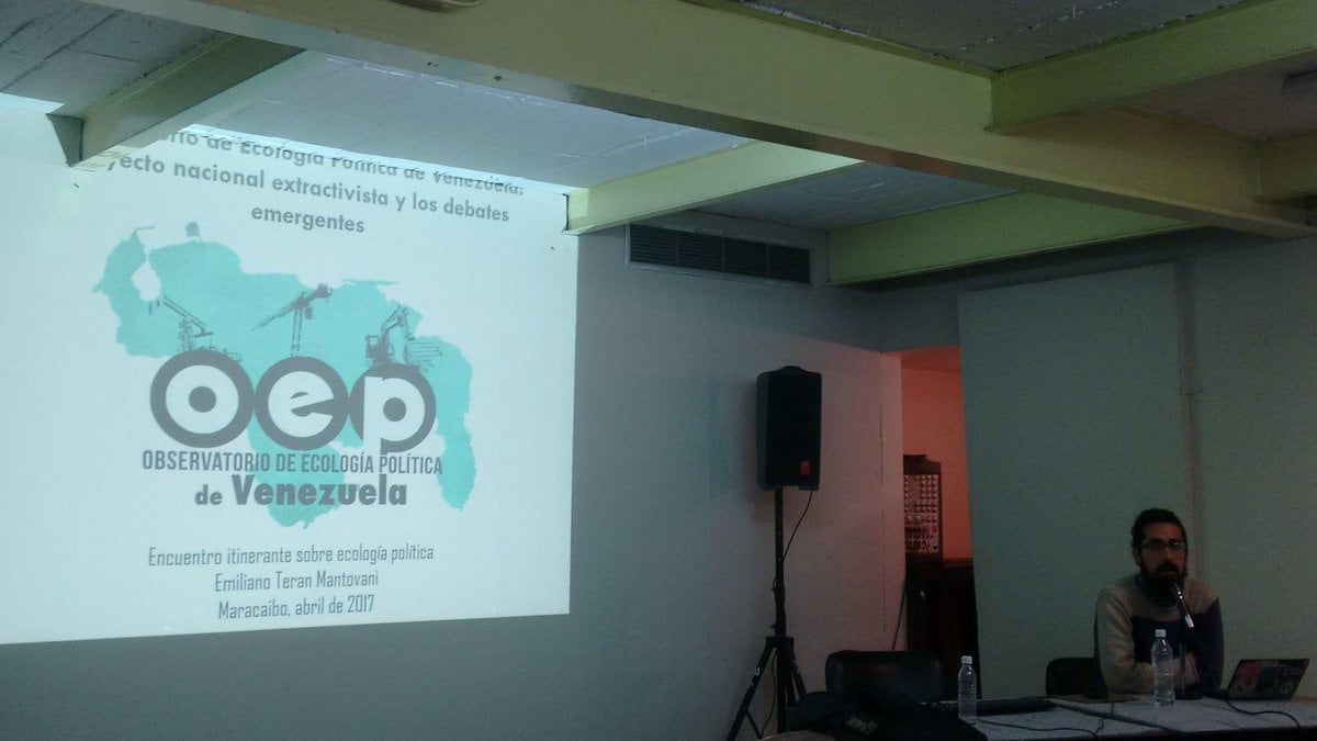 Al terminar la exposición sobre el “Lago” de Maracaibo, inició la ponencia de Emiliano Terán Mantovani, quien expuso un valioso análisis sobre el horizonte ecológico de Venezuela y las luchas de resistencia que existen en torno a los proyectos mineros de alto impacto ambiental, a través de una serie de estudios que articulan la ecología económica y la ecología política. Mantovani precisó el avance de la huella ecológica que el modelo petrolero ha dejado en Venezuela y las proyecciones que el proyecto neoextractivista nacional presenta en nuestro país, particularmente el Arco Minero del Orinoco.