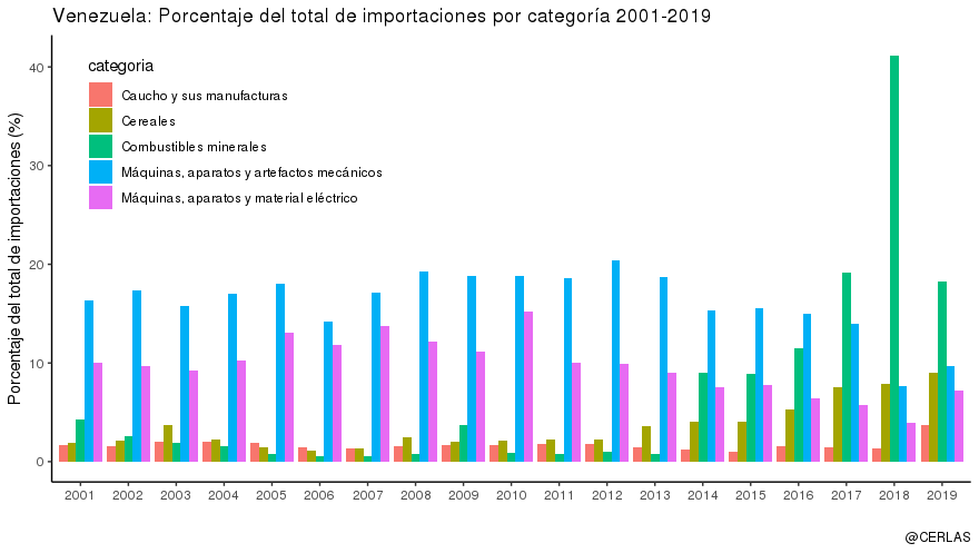 El precio subsidiado de la gasolina fue aprovechado históricamente por sectores de poder mediante el tráfico en la frontera [4], generando un saqueo sistemático que, sumado a la negligencia, corrupción, desinversión y endeudamiento de PDVSA, finalmente acabó con la producción nacional. Esto nos ha conducido a una insólita situación: siendo un país petrolero, necesitamos importar enormes cargamentos de gasolina. De hecho, como se aprecia en la figura 1, las bases que soportan la economía venezolana se han hecho más dependientes del mercado internacional, al punto que la importación de combustibles minerales y sus derivados, que son necesarios en buena medida para dar soporte a la industria petrolera, pasó de representar el 4,2% del total de importaciones en 2001 a más del 41% en 2018, mientras que la importación de cereales, que pueden ser perfectamente producidos en el país, creció de 1,8% en 2001 a casi 10% en 2019. Estos datos reflejan el desmantelamiento de la estructura productiva nacional y la mayor dependencia hoy de las importaciones para sostener el funcionamiento de la sociedad.