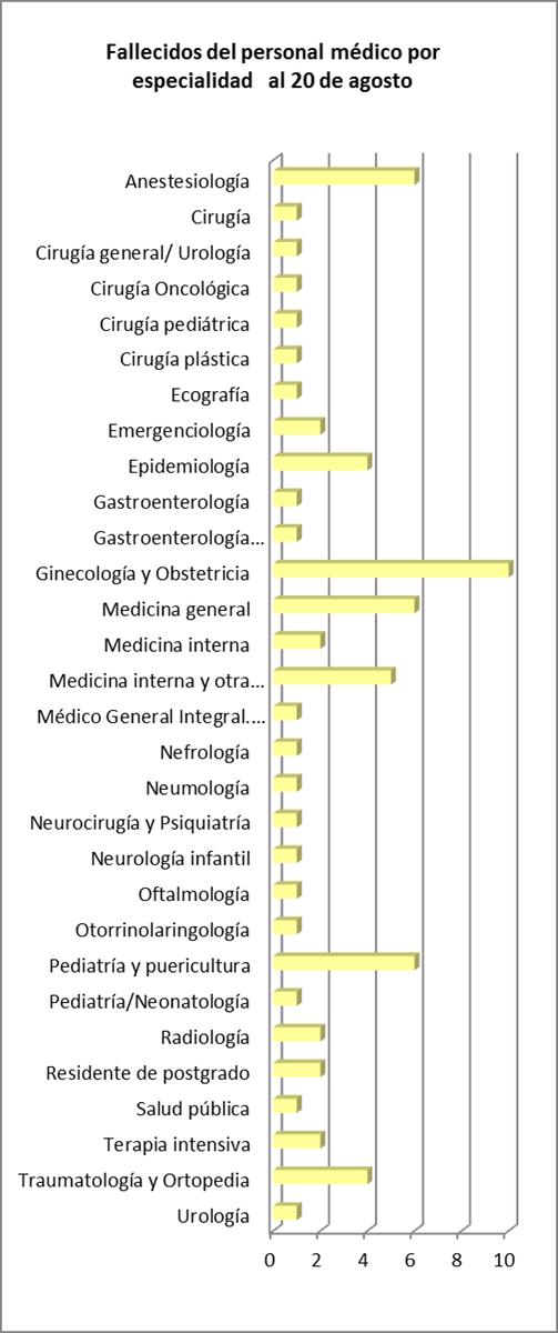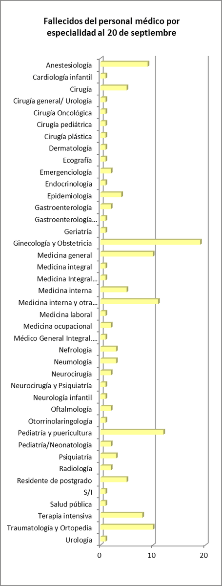 Para el 20 de septiembre hubo un total de 137 médicos fallecidos, y así como aumentó la cantidad de decesos también la diversidad de especialidades, en este caso hubo pérdidas en 40 especialidades, y un solo caso a quien no se le pudo determinar. Las especialidades más afectadas fueron Ginecología y Obstetricia (19), Pediatría y puericultura (12), Medicina interna (16) (Medicina interna: 5; Medicina interna y otra especialidad: 11), Medicina general (10), Traumatología y Ortopedia (10), Anestesiología (9) y Terapia intensiva (8).