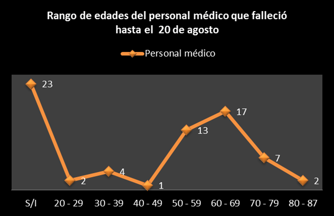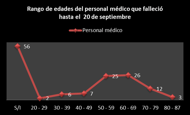 El personal de salud hasta el 20 de septiembre representaba el 35,3% de los fallecidos a nivel nacional, siendo el personal médico el que más decesos sufrió (70,9%), en edades comprendidas en su mayoría entre 60 y 69 años, también hubo más fallecidos masculinos que femeninos (72,9%, 27%, respectivamente). Las especialidades que más bajas médicas tuvieron fueron Ginecología y Obstetricia, Pediatría y puericultura, Medicina interna, Medicina general, Traumatología y Ortopedia, Anestesiología y Terapia intensiva. Del 20 agosto al 20 septiembre aumentó en un 49,7% la cantidad de galenos difuntos, un total de 137 casos.