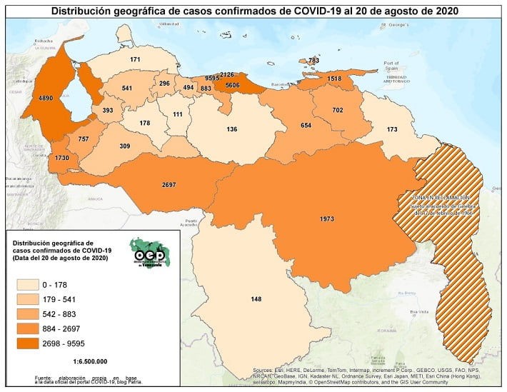 Destaca claramente el aumento de casos confirmados (44,6%) y fallecidos (44,7%) en Venezuela a un mes de diferencia. La cartografía sobre casos confirmados para el 20 de agosto y 20 de septiembre, revela que si bien los estados que presentan las mayores cifras de casos confirmados para ambas fechas en todo el territorio nacional son Distrito Capital, Miranda, Zulia, Apure, La Guaira (Vargas), Táchira y Bolívar, algunos precisamente por ser estados fronterizos y los otros por estar próximos a la capital del país donde inició el primer brote, destaca el incremento de casos para septiembre en estados como Nuevas Esparta (65,7%), Carabobo (50,2%), Lara (53,5%), Yaracuy (55,4%), Monagas (64,2%), Trujillo (54 %), Barinas (67,5%), Delta Amacuro (67,4%), Amazonas (66,2%), Falcón (61,4%), Guárico (65, 6%) y Portuguesa (61,7%).