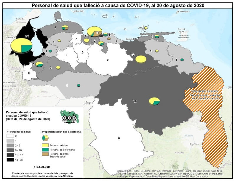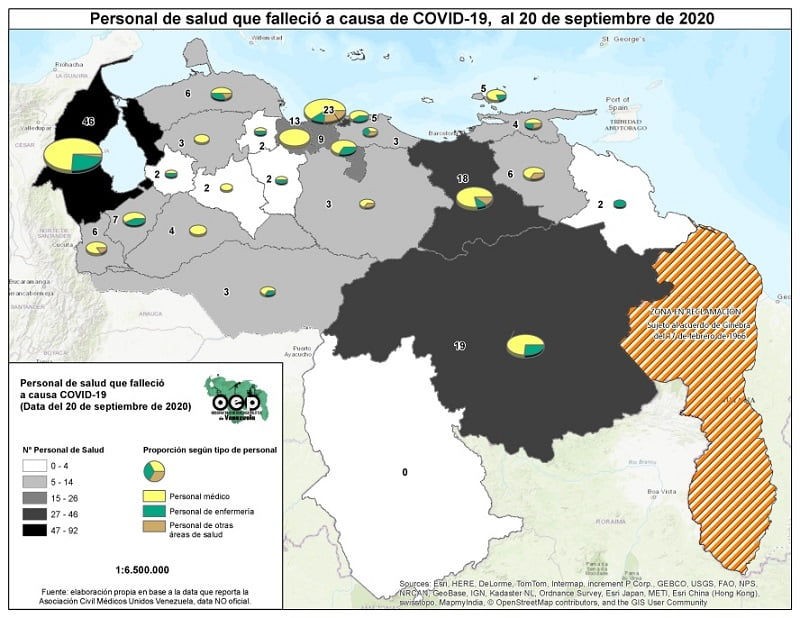 El reporte del 8 de octubre de la Asociación Civil Médicos Unidos Venezuela, sumó 7 personas más a la data de fallecidos por COVID-19 desde junio del año en curso, totalizando 230 fallecidos hasta dicha fecha, pertenecientes 163 al personal médico, 51 al personal de enfermería y 16 de otras áreas de la salud; para la misma fecha la data oficial publicó 678 muertes en el país[12], correspondiendo entonces 33,9% de los decesos al personal de salud.