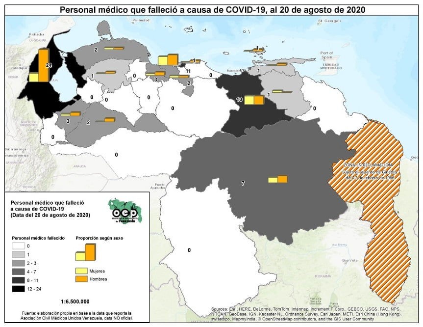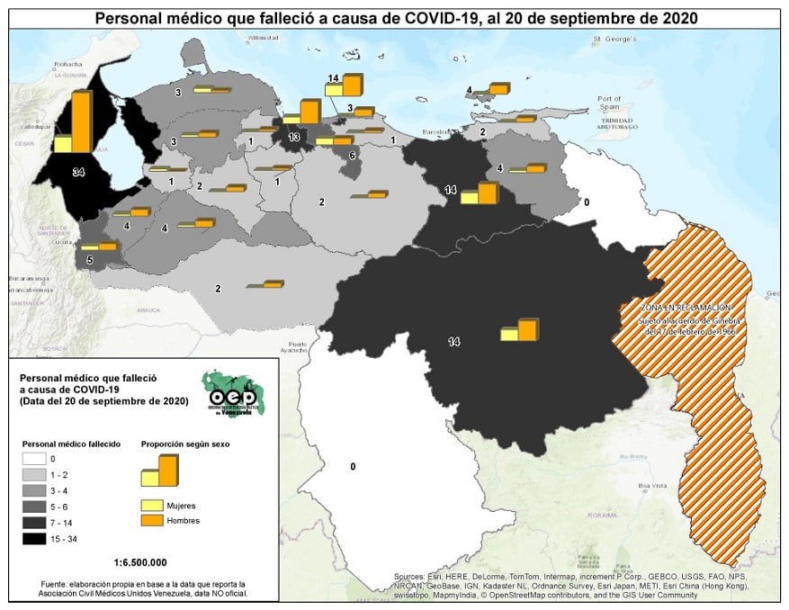 Los mapas muestran que en todas la entidades donde hubo casos de fallecidos del personal médico el mayor porcentaje fue de hombres. Destacan al 20 de agosto las entidades donde más decesos de masculinos hubo, Zulia (19), Distrito Capital (6), Anzoátegui (5) y Bolívar (4); para el 20 de septiembre habían aumentado en un 54% los decesos del personal masculino, siendo los estados con más casos Zulia (27), Carabobo (10), Distrito Capital (9), Anzoátegui (9), Bolívar (9) y Nueva Esparta (4). Que el mayor número de muertes corresponda al personal masculino puede estar vinculado con que los hombres tienen mayor incidencia que las mujeres en padecer enfermedades crónicas, relacionadas a los hábitos como, alimentación desbalanceada o el consumo de tabaco y alcohol, presentando entonces los hombres más factores de riesgo[11] que las mujeres.