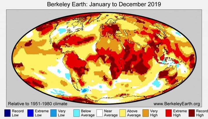 De acuerdo con el informe de Berkeley Earth, 2019 fue el segundo año más cálido en la Tierra desde 1850. La temperatura media global en 2019 fue más fría que 2016, pero más cálida que cualquier otro año que se haya medido directamente. En consecuencia, 2016 sigue siendo el año más cálido en el período de observaciones históricas. Es probable que las clasificaciones de año a año reflejen la variabilidad natural a corto plazo, pero el patrón general sigue siendo consistente con una tendencia a largo plazo hacia el calentamiento global.