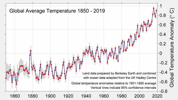 La temperatura media global en 2019 se estimó en 1.28 ° C (2.31 ° F) por encima de la temperatura promedio de fines del siglo XIX, de 1850 a 1900, un período que a menudo se usa como una línea de base preindustrial para objetivos de temperatura global.