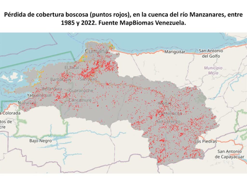 Yo creo que esa tragedia que acaba de ocurrir en Cumanacoa es un problema multifactorial. Son muchos aspectos que inciden en la ocurrencia y en las consecuencias que tuvo ese evento, y pienso que uno de los factores que tuvo alta relevancia es la deforestación. De acuerdo a la cartografía que se ha realizado para todo el país, que tiene bastante detalles, desarrollada con el proyecto MapBiomas Venezuela, en la cuenca del río Manzanares hubo una deforestación entre 1985 y 2022 de 9.200 hectáreas, es decir, se destruyó toda esa superficie de bosques en tan solo 37 años. Eso significa que todos los días se están tumbando 0,7 hectáreas de bosque, lo cual indica que casi todos los días hay alguien tumbando árboles y destruyendo ese ecosistema.