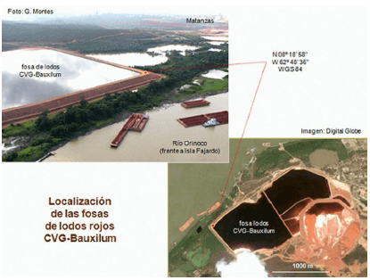 GMU– Nada bueno, en cualquier momento puede ocurrir algo terrible. Ya vamos a hablar de eso, pero primero comencemos por esto: en Venezuela la industria del aluminio está localizada en “Los Pijiguaos”, eso está en el municipio Cedeño del estado Bolívar. Allí se encuentra la mina de bauxita de Bauxilum, con unas reservas probadas de más de 300 millones de toneladas métricas. Esa zona está en el área 1 del Arco Minero del Orinoco. La bauxita extraída de “Los Pijiguaos” es transportada en ferrocarril hasta el río Orinoco y luego es embarcada en gabarras hasta Ciudad Guayana; allí, en la planta de Bauxilum, es procesada para producir alúmina. El proceso químico utilizado por Bauxilum para obtener alúmina fue patentado en el año de 1887 por el alemán Karl Bayer. Como ya hemos dicho, ese procesamiento genera lodos rojos. Desde 1997, Bauxilum deposita sus lodos rojos en tres lagunas adyacentes al río Orinoco, en las instalaciones que esta compañía posee en Ciudad Guayana. Esas lagunas conforman un sistema diseñado en 1979 con una vida útil de 21 años.