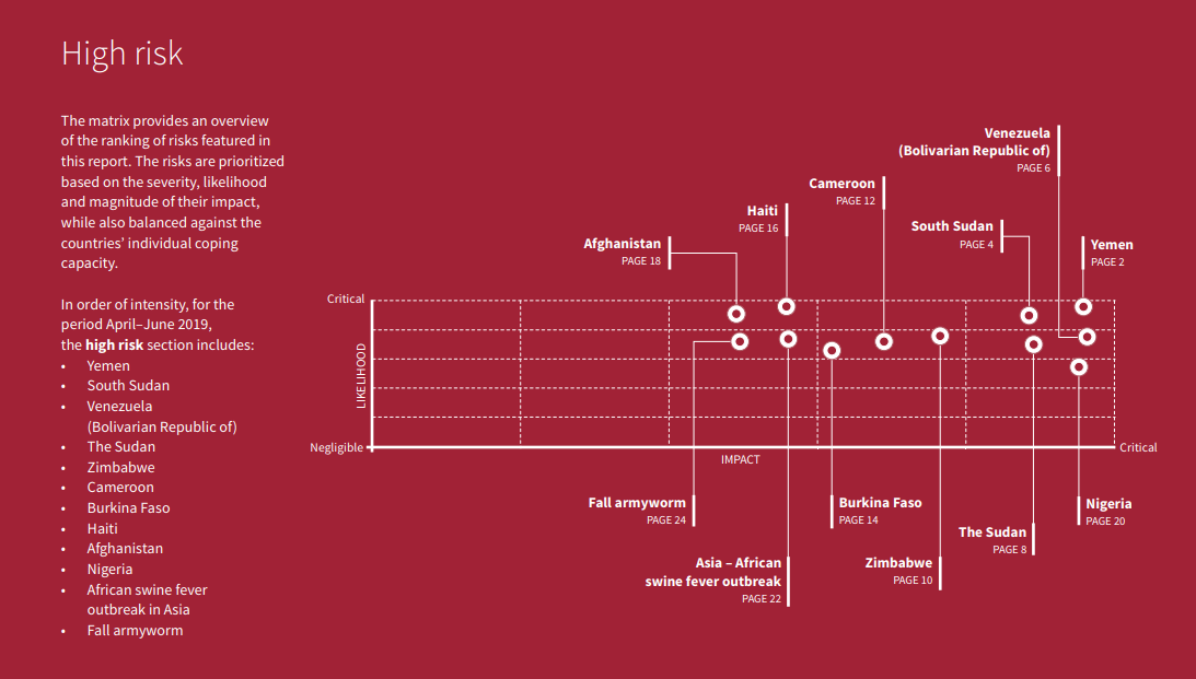 El informe, que proporciona análisis trimestrales de los principales riesgos de desastres y emergencias de este tipo, coloca a Venezuela en el tercer lugar de este ranking, en orden de intensidad (nivel alto de probabilidad y de impacto). Los otros países señalados son Yemen, Sudán del Sur, Sudán, Zimbabwe, Cameroon, Burkina Faso, Haití, Afghanistán y Nigeria.