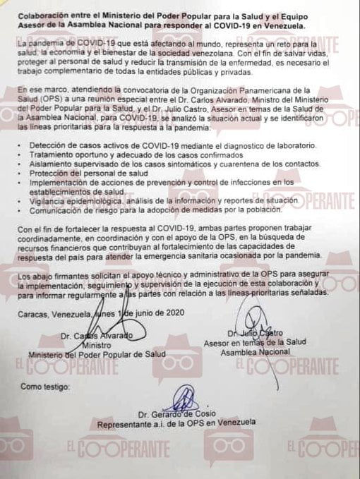 Este 2 de junio se dio a conocer un documento firmado por representantes del gobierno de Nicolás Maduro y de un sector de la oposición, denominado G4 (que agrupa los cuatro partidos mayoritarios de la oposición Primero Justicia, Acción Democrática, Un Nuevo Tiempo y Voluntad Popular). El  convenio fue suscrito por el ministro de Salud, Carlos Alvarado, el asesor en temas de salud de la Asamblea Nacional, Julio Castro, y como testigo, el representante de la Organización Panamericana de la Salud / Organización Mundial de la Salud en Venezuela, Gerardo de Cossio.