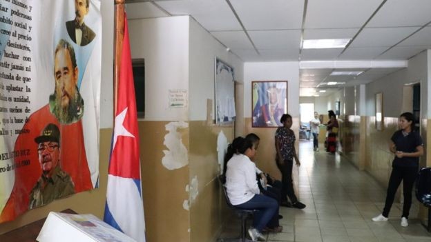 Este es uno de los centros sanitarios de Venezuela en los que trabajan médicos cubanos y a diario los pacientes aguardan junto a retratos de Hugo Chávez, Nicolás Maduro y Fidel Castro a recibir su tratamiento.