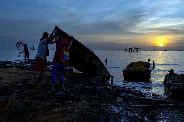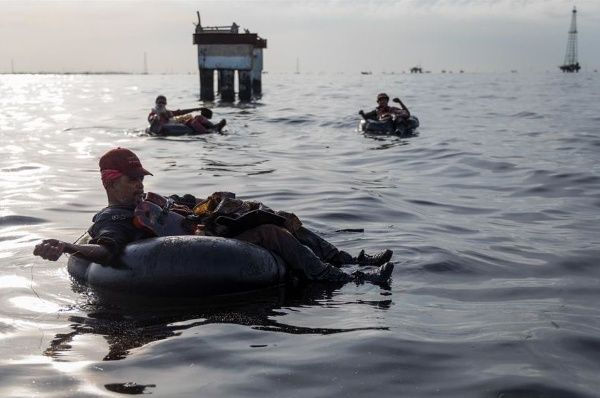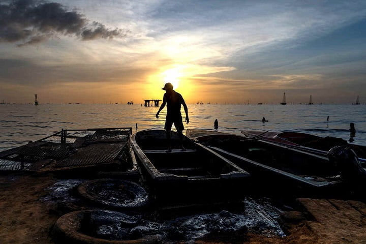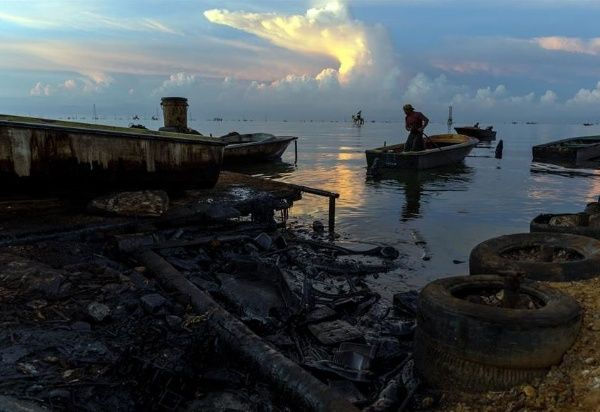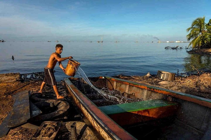 En su caso, necesita la gasolina para su rudimentaria embarcación y para asearse al final de cada faena, cuando sus ropas son tan negras como el petróleo en el que se sumerge en búsqueda de peces que, al menos, parezcan comestibles. Solo el combustible logra arrancar el crudo pegado a cada parte de su cuerpo.