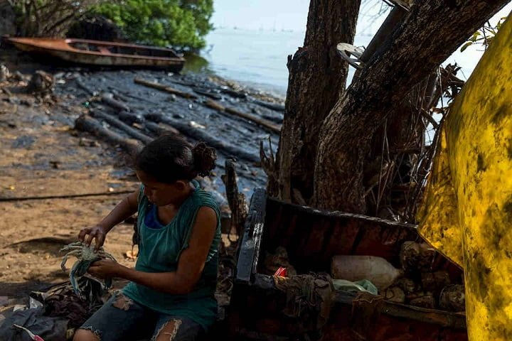 «El pescado viene lleno de petróleo», lamenta, con la misma fatiga que le causa deshacerse de esta capa grasienta que solo sale con gasolina, un líquido que le quema poco a poco la piel.