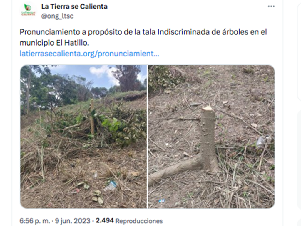 En 2023, la organización La Tierra se calienta, denunció la tala de 50 árboles entre La Lagunita y La Unión, en el municipio Hatillo. Estos árboles habían sido sembrados por esta misma organización siete años atrás14.