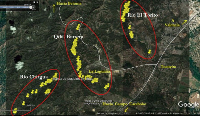 La información recogida en el estudio apunta que río Chirgua, quebrada Barrera-La Lagunita, río El Torito y la quebrada de Pirapira son las zonas donde hay un resurgimiento de la minería aurífera desde el 2012. Aunque no se evidencia el uso del mercurio en esos enclaves mineros, la investigación concluye que el extractivismo incrementó la deforestación, el desvío de drenajes y la cantidad de sedimentos hacia la represa Pao Cachinche, que abastece de agua a 3 millones de personas y que forma parte del acueducto Regional del Centro que surte a Valencia, Aragua y Cojedes