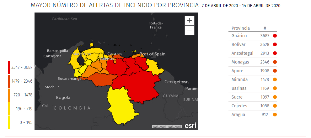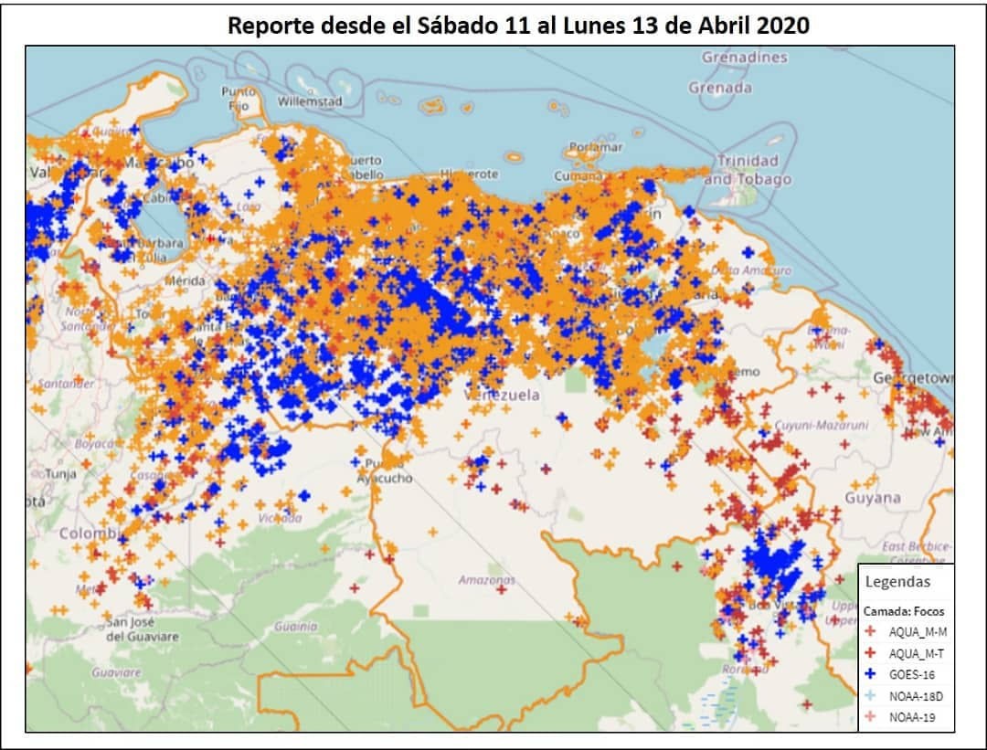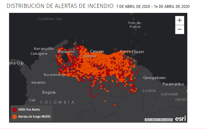 La información provista por el INAMEH es además consistente con los reportes que señala el Informe de incendios para Venezuela del Global Forest Watch Fires para el periodo entre el 7 y el 14 de abril de 2020 que indica que hubo 5.024 puntos de alerta de incendios MODIS y 19.107 alertas de incendios VIIRS. De acuerdo con este informe se trata de anomalías térmicas desde una superficie que produce una cantidad sustancial de calor, que podrían ir desde un incendio hasta una carretera de asfalto caliente.