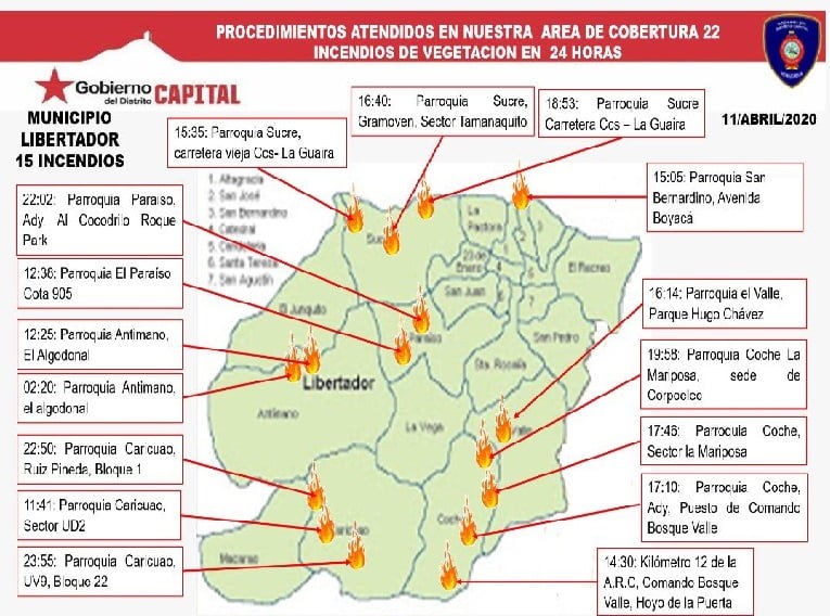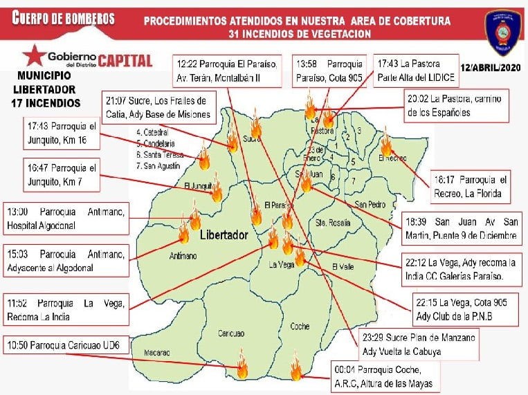 El pasado fin de semana del 10 al 11 de abril se registraron al menos 53 incendios en el área capital de Venezuela, ocasionando la afectación de más de 200 hectáreas de vegetación en esta región del país, de acuerdo con información publicada por el Cuerpo de Bomberos de Distrito Capital y los medios Últimas Noticias y Crónica Uno.