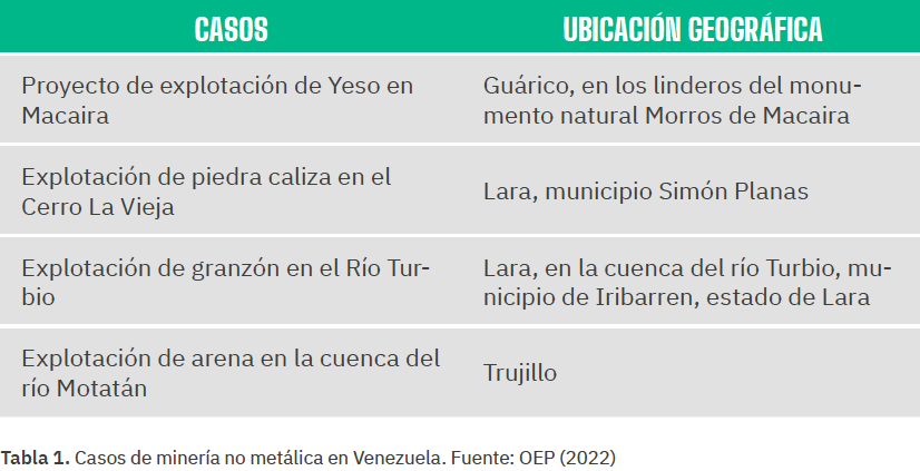 Aunque los conflictos socioambientales provocados por la minería no metálica en Venezuela tienen muy poca visibilidad, en estos hay un historial de luchas que impulsan las comunidades locales para defender los ríos, cuencas hidrográficas y montañas, del despojo y la degradación que trae consigo estas prácticas en sus territorios. En la Tabla 1 se mencionan algunos casos de minería no metálica en Venezuela.