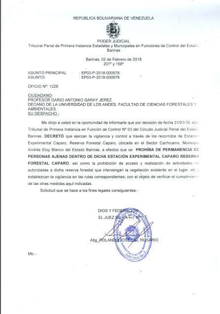El ministro también anunciaba una inspección en las 174 mil hectáreas de bosques de la reserva forestal, para asegurarse de la preservación de la flora y fauna que posee la zona; la evaluación del comodato que tiene la Universidad de Los Andes (ULA) con el Minea; y la incorporación de la Empresa Nacional Forestal, la Comisión Nacional de Reforestación (Conare) y la Misión Árbol, a las mesas de trabajo.