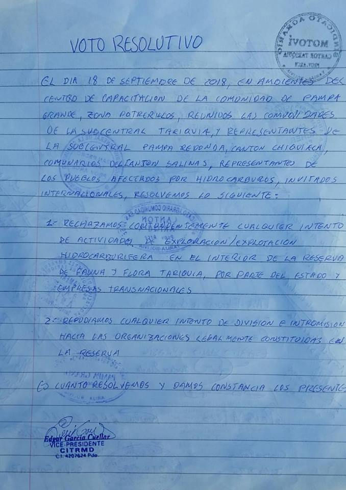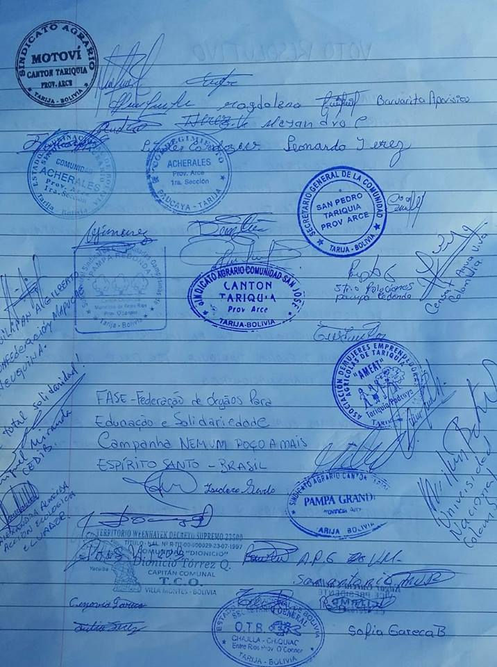 Del encuentro surgió un Voto Resolutivo firmado por las comunidades locales, representantes de comunidades indígenas y campesinas afectadas por la actividad hidrocarburífera de varias regiones del país, representantes de las subcentrales campesinas de Tariquía y las organizaciones latinoamericanas presentes.