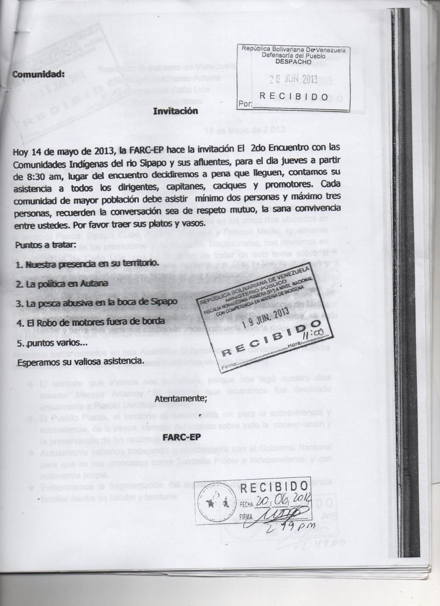 Frente a esta incursión guerrillera, en el 2013, la Organización de Piaroas Unidos del Sipapo (en adelante OIPUS) del municipio Autana entregó a instituciones estatales como la Defensoría del Pueblo, Ministerio de Interior y Justicia, así como Presidencia y Vicepresidencia de la República, denuncias de las comunidades y copias de las invitaciones firmadas por la FARC-EP en las que se convoca a los indígenas para dialogar sobre “la convivencia” con el grupo armado. (FOTO 1)