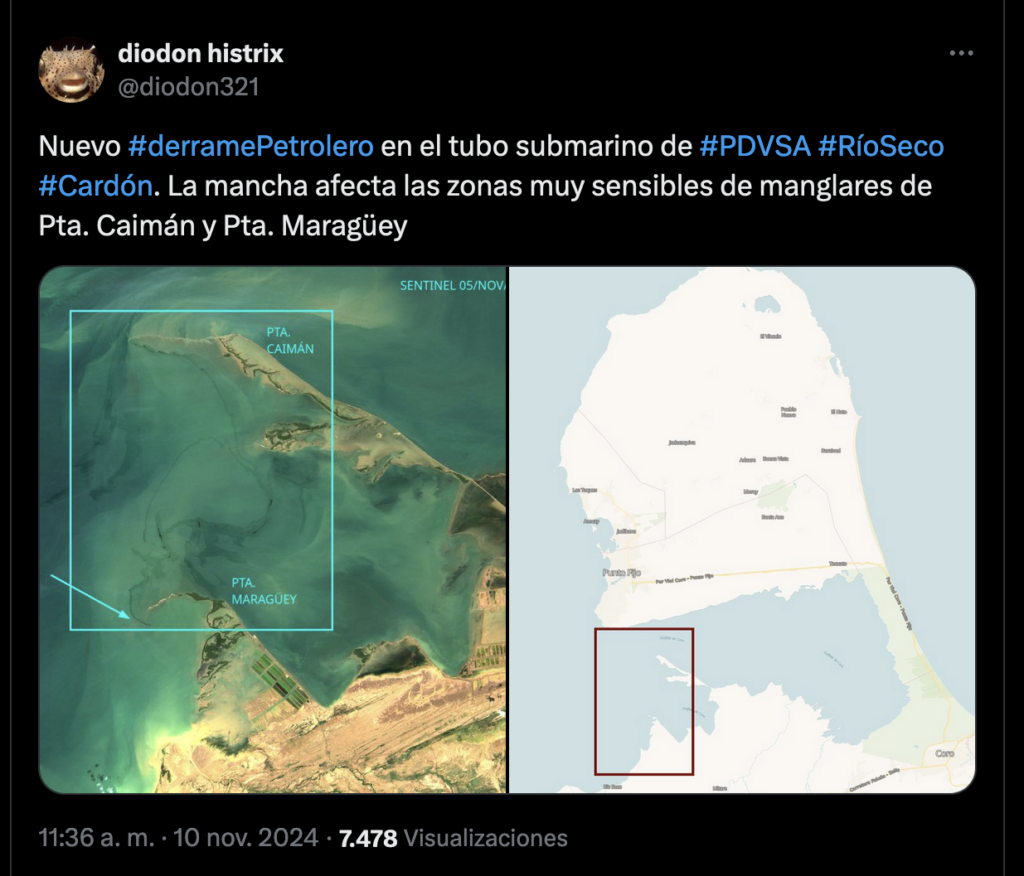 El 10 de noviembre, el profesor Eduardo Klein identificaba imágenes satelitales de un derrame de crudo en Río Seco, estado Falcón.