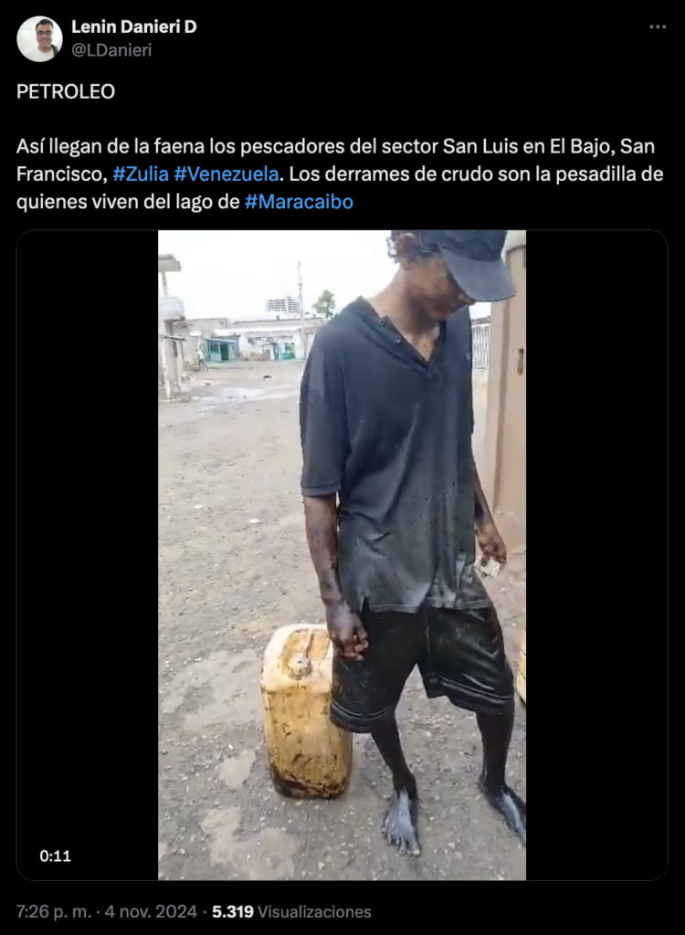 El 4 de noviembre, un video en la red social X mostraba como los pescadores del Bajo en el municipio San Francisco, en el estado Zulia, volvían embadurnados de petróleo, luego de la faena de pesca en el Lago de Maracaibo. Estas imágenes reflejan sin duda una de las dimensiones que acarrea la contaminación del Lago de Maracaibo; comunidades enteras afectadas tanto económicamente como en su salud física por la situación de degradación ambiental causada por los constantes derrames petroleros.