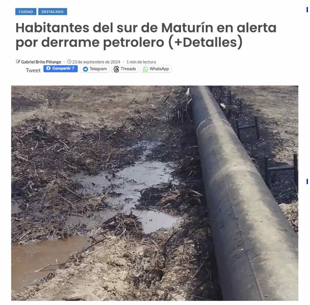 El 24 de septiembre, la avería de un oleoducto, ocasiono un derrame de petróleo en el sur de Maturín, en el estado Monagas. Al menos dos comunidades han sido afectadas por este derrame, que tiene dos meses activo, según reportaje de medio local.