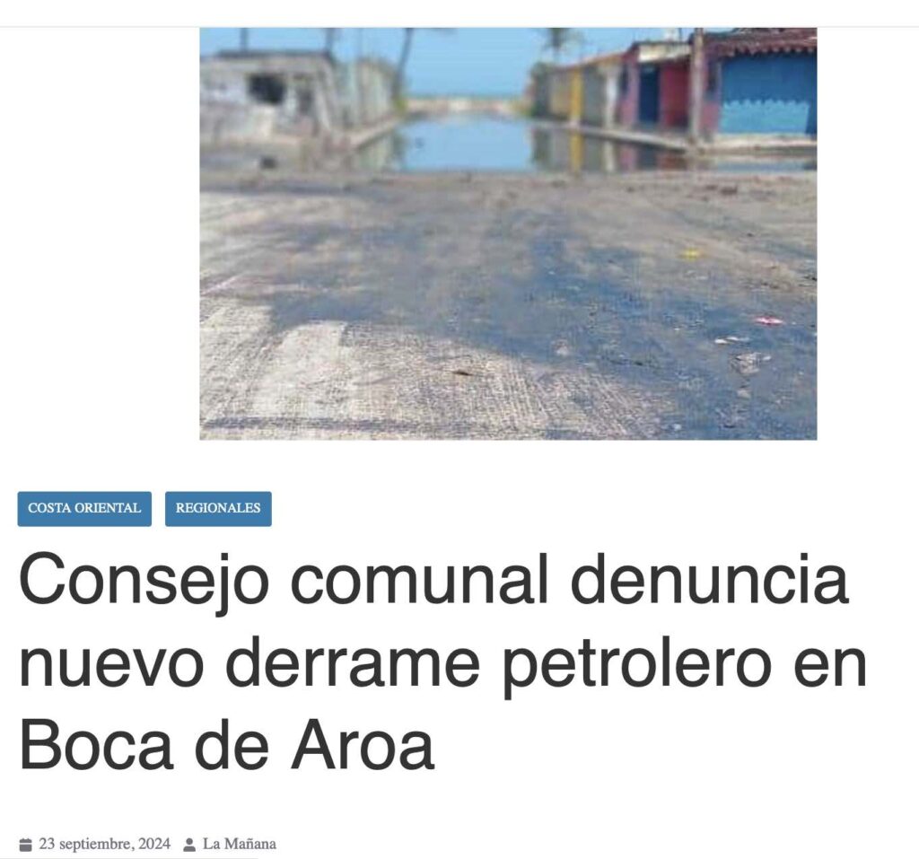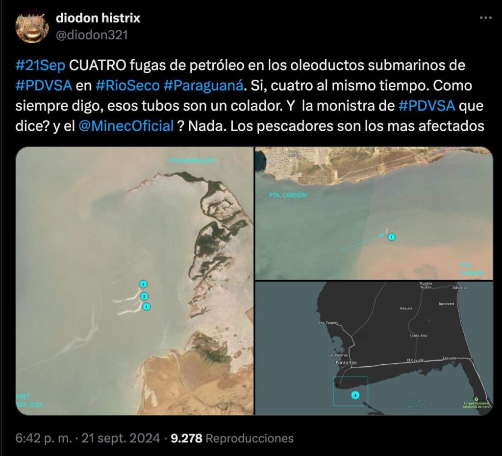 Por otra parte, el 21 de septiembre se reportaban cuatro fugas activa de crudo en los oleoductos de Río Seco, en el estado Falcón. Los pescadores del Golfete de Coro vienen padeciendo las consecuencias de esta problemática recurrente desde hace varios años.
