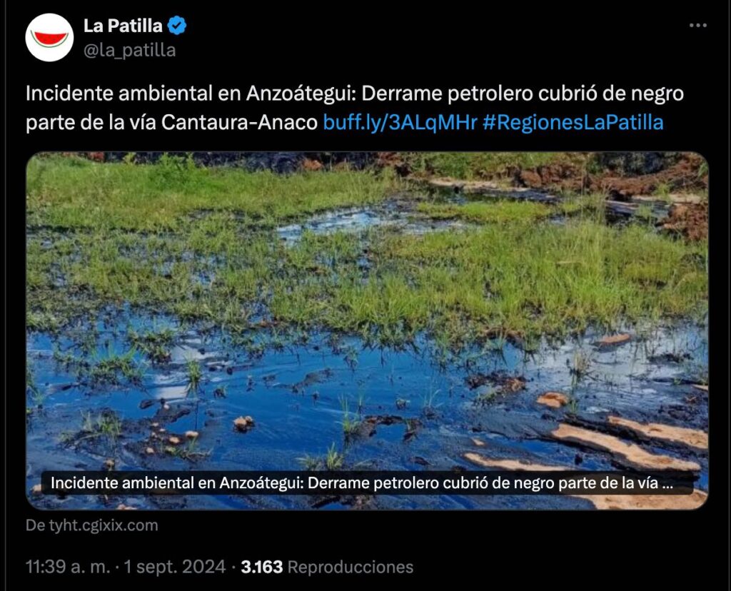 El 1 de septiembre, se reportó un derrame petrolero que afectó la carretera de Cantaura-Anaco, ubicada en el estado Anzoátegui. Según reportaje del medio informativo La Patilla, el origen de este derrame se debió a la corrosión de las tuberías del oleoducto. La empresa estatal PDVSA realizó el saneamiento ambiental correspondiente y corrigió la fuga de crudo que se ubicaba al costado de la vía de Cantaura-Anaco.