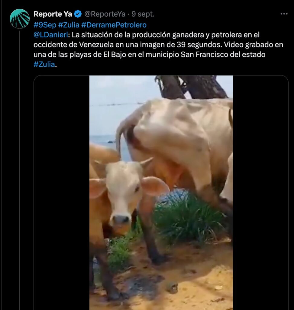 El 9 de septiembre, denunciaban la grave situación que se vive en el municipio San Francisco, en el estado Zulia, debido a los derrames petroleros. El periodista Lenin Danieri mostraba un video en redes sociales en el que se puede apreciar como varios especímenes de ganado vacuno presentaban restos de crudo en sus patas y en otras partes del cuerpo, como evidencia de las afectaciones que produce los accidentes en la industria petrolera en la ganadería en el Zulia.