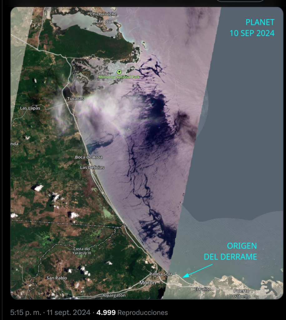 Para el 10 de septiembre, el biólogo marino Eduardo Klein reportaba como las manchas de crudo, debido al derrame en Planta Centro, llegaban a Boca de Aroa, en el estado Falcón.