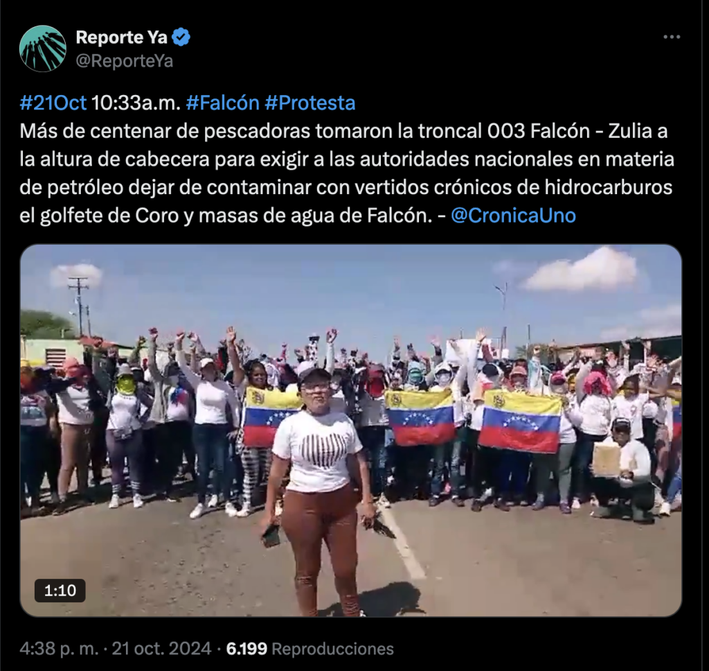 Un grupo de pescadoras de Falcón bloqueó el tránsito en la troncal Falcón-Zulia el pasado 21 de octubre, exigiendo una solución definitiva a los constantes derrames de petróleo que afectan sus comunidades. Esta grave problemática ha generado una crisis económica para miles de familias que dependen de la pesca.