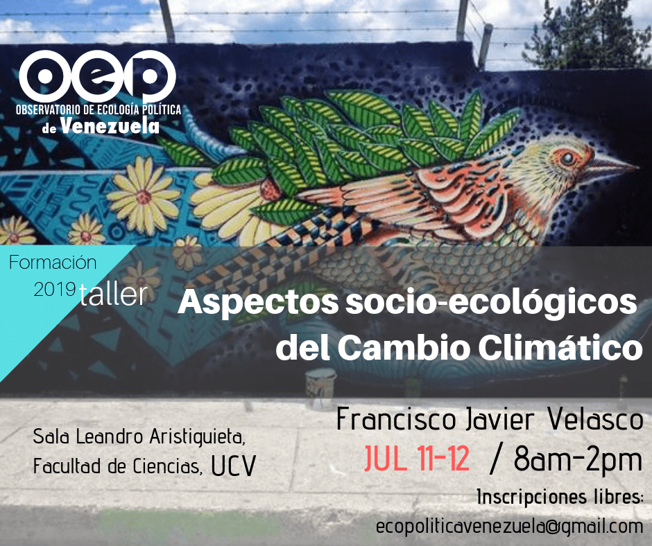 Los días jueves 11 y viernes 12 de julio se realizará el taller «Aspectos Socio-Ecológicos del Cambio Climático», dictado por el investigador y activista Francisco Javier Velasco del Observatorio de Ecología Política de Venezuela en la Sala Leandro Aristeguieta de la Facultad de Ciencias de la UCV, Caracas.
