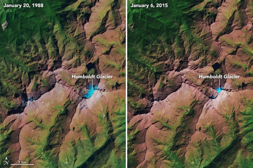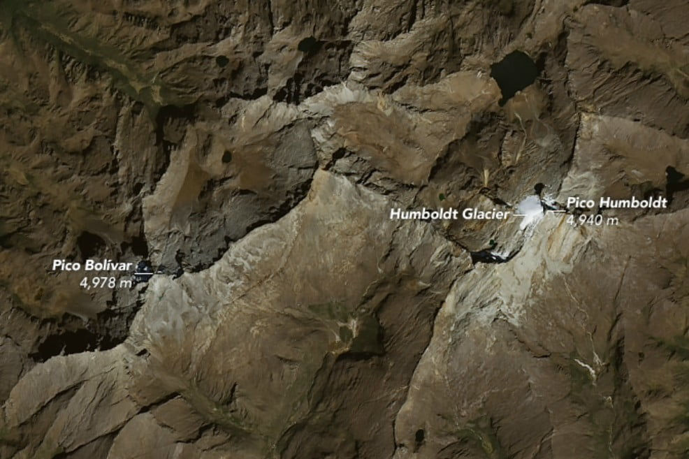 La Sierra Nevada de Mérida tenía 10 km² de hielo en 1910. En 2018, tiene menos de 0,1 km² de superficie glaciar. De las Cinco Águilas Blancas que cantó Tulio Febres Cordero, los picos Bolívar, Humboldt y Bonpland (ambos formaban un águila), Concha, León y Toro, queda uno solo: el de Pico Humboldt, el cual se derrite aceleradamente.